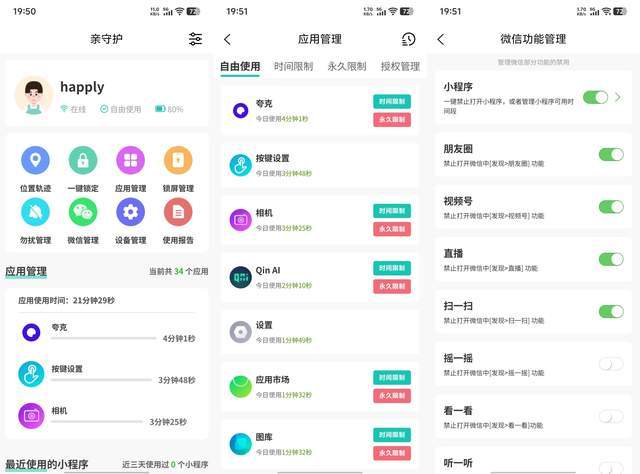 亲守护是多亲手机防沉迷的核心功能,家长们安装绑定后就可以来远程管理学生的手机。比如孩子在安装各种应用时都需要家长的授权。已安装的APP也可以限制其使用时长,甚至限制其单独功能(如微信就可以设置为禁止查看朋友圈、刷直播或视频号,禁止使用扫一扫等功能)。这样就可以从源头上杜绝娱乐向或不良APP的引诱。此外,孩子用的每个APP都可以查看使用的时段和时长,以便家长更精准的掌握孩子的学习、使用动向。而诸如位置信息的同步轨迹追踪这样的标配功能自然也有,限于篇幅就不多言了。总之,通过亲守护,建立起了家长与学生间的健康成长和学习的防线,我觉得是十分有效的。