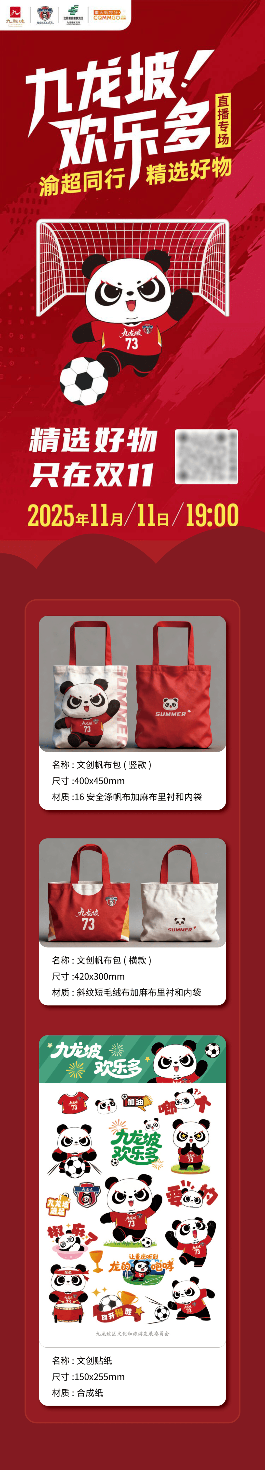 活动围绕“九龙坡文旅好物+渝超激情”双主题联动开展,抖音、淘宝、微信三大平台直播间同步上线。直播间背景将融入渝超赛事特色元素,营造浓厚氛围。重点打造双11专场直播,11月11日19:00锁定“耍娃儿直播间”,微信扫码即可预约参与:1分钱秒杀建川博物馆、重庆动物园门票,抽取渝超奥体主场门票;更有“奇三妹”文创周边首场发售,近距离感受九龙坡渝超足球形象大使的独特魅力,同时可享餐饮住宿、乡村遛娃、非遗好物等专属独家折扣,解锁多重文旅福利。